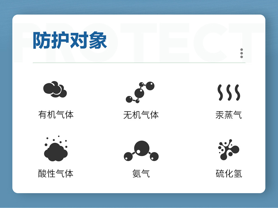 防護范圍:主要防護有機、無機、酸性氣體或蒸汽、氨及氨的有機衍生物、硫化氫氣體、汞蒸氣
