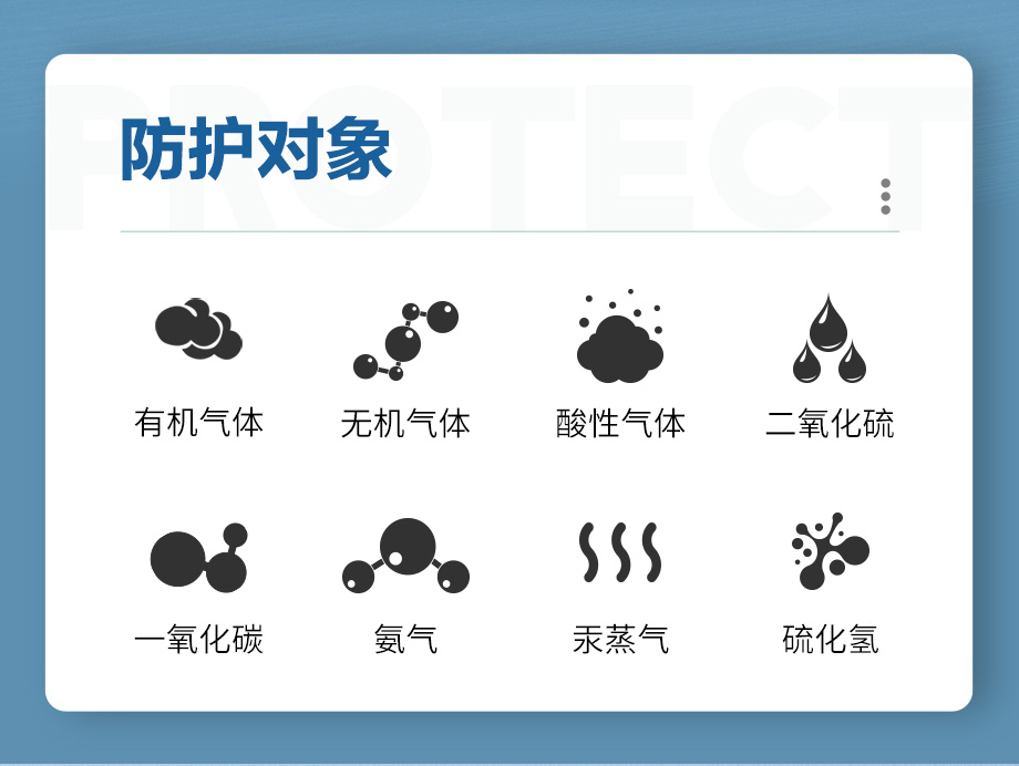 防護范圍:主要防護有機、無機、酸性氣體或蒸汽、氨及氨的有機衍生物、硫化氫氣體、汞蒸氣、一氧化碳氣體