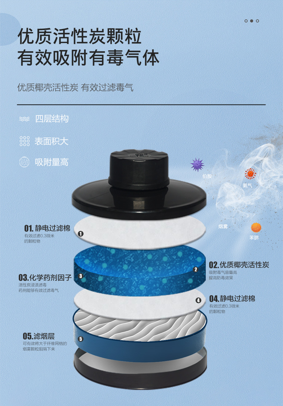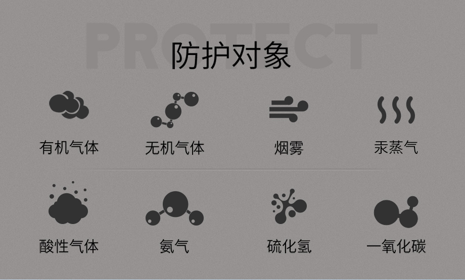 防護范圍:主要防護有機、無機氣體、酸性氣體、氨氣、硫化氫、汞蒸氣、一氧化碳及煙霧