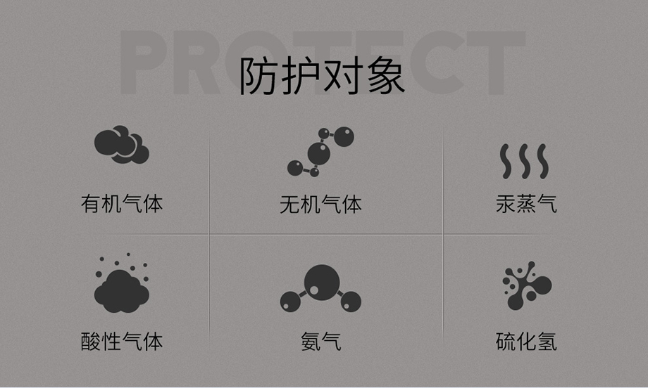 防護范圍:防護有機氣體、無機氣體、酸性氣體、氨氣、硫化氫、汞蒸氣