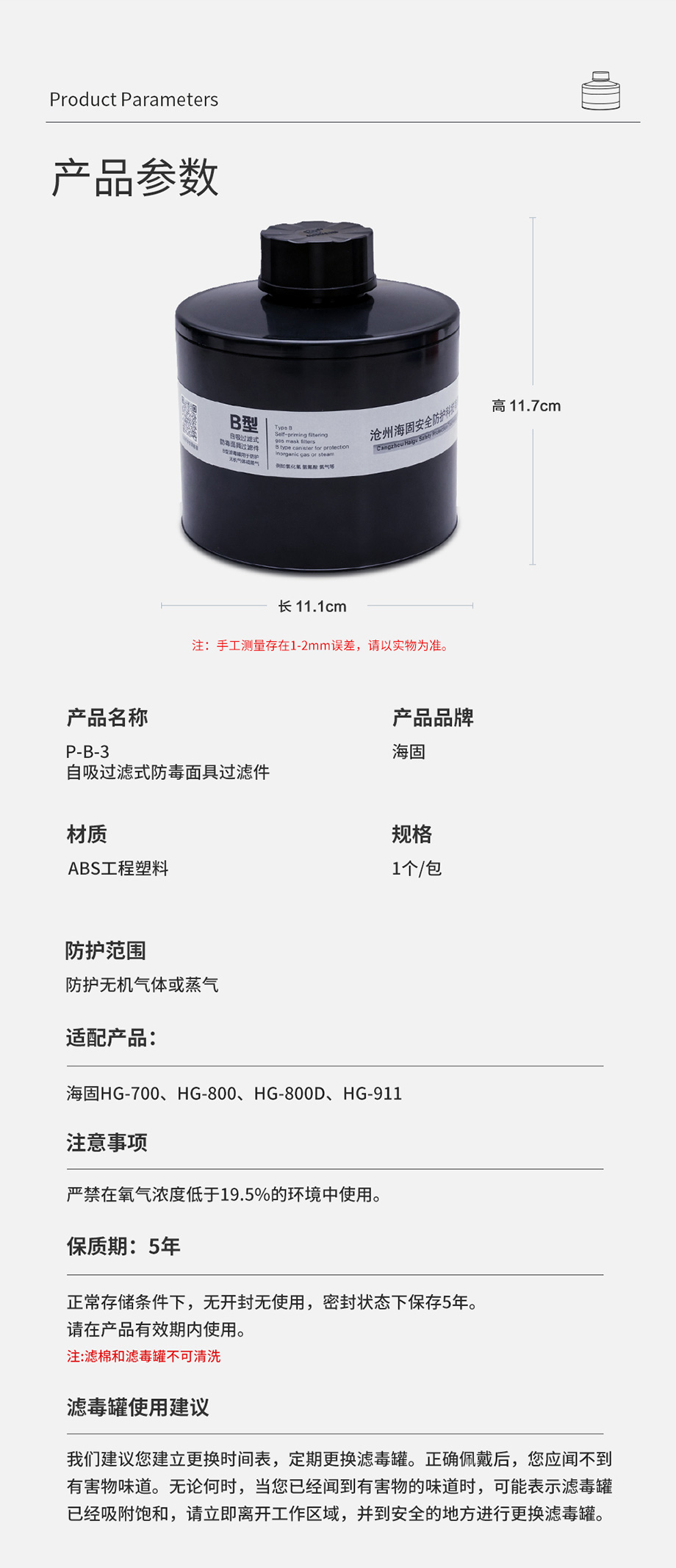 海固P-B-3濾毒罐 防護氯化氫、氫氰酸、氯氣等無機氣體三級濾毒罐